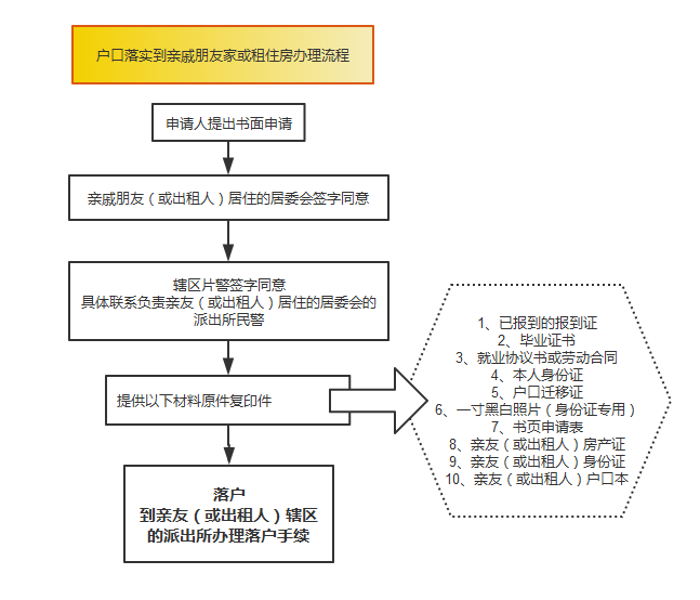 (1)凭夫妻双方居民户口簿、居民身份证、结婚证、乡镇村组同意落户证明意见 (2)另一方系非农业户口的,还需提供非农业户口一方在现户口所在地街道办事处(社区)出具的无工作单位证明意见、市房屋产权管理部门出具的迁入人及未成年子女无住房证明意见。 2、父母投靠成年子女落户(1)提交申请表、投靠人和被投靠人的居民户口簿、居民身份证、父母子女关系证明。 (2)年满16周岁的省外迁入人员或在省级人口系统无照片的省内迁入人员,还须提交近期标准证件照片2张。 3、收养入户材料 (1)公民个人依法收养的:提交申请表、民政部门出具的《收养证》和收养人的居民户口簿、居民身份证。 (2)社会福利机构收养社会弃婴:提交申请表、社会福利机构或公安派出所出具的相关证明材料。 4、长沙干部、职工调动、录用落户材料 (1)提交申请表,人事、劳动、垂直管理部门的调动、录用证明和迁入人员的居民户口簿、居民身份证。 (2)有家属随迁的,还须提交随迁人员居民户口簿、居民身份证(不满16周岁可免交)、亲属关系证明、超过法定结婚年龄子女的未婚证明。 (3)未成年子女随迁,父母离异的,还须提交父母离婚判决书或协议书,申请表(或申请报告)须父母双方签名。 5、家属随军落户 (1)提交申请表、部队师(旅)级以上单位政治部门批准军人家属随军的证明材料和迁入人员的居民户口簿、居民身份证、亲属关系证明。 (2)年满16周岁的省外迁入人员或在省级人口系统无照片的省内迁入人员,还须提交近期标准证件照片2张。 6、长沙投资兴业落户 (1)迁入人要求落户工作单位所在地户口登记机关的,需提供用工单位《雇聘外来人员治安管理责任书》; (2)要求落户现租住所在地户口登记机关的,需提供房屋租赁合同、《出租房屋治安责任保证书》、房屋出租人身份证复印件; (3)要求落户亲友户口所在地户口登记机关的,需提供亲友居民户口簿、居民身份证。 7、购房入户 (1)提交申请表、我市的私有住宅房屋产权证(按揭房提交银行盖章确认的房屋产权证复印件)、迁入人居民户口簿、居民身份证, (2)有家属随迁的,还须提交随迁人员居民户口簿、居民身份证(不满16周岁可免交)、亲属关系证明、超过法定结婚年龄子女的未婚证明。 (3)未成年子女随迁,父母离异的,还须提交父母离婚判决书或协议书,申请表(或申请报告)须父母双方签名。 (4)对于年满16周岁的省外迁入人员或在省级人口系统无照片的省内迁入人员,还须提交近期标准证件照片2张。 8、人才引进落户 (1)用人单位聘用合同 (2)劳动和社会保障部门出具的已缴纳社会保险证明 (3)迁入人员的居民户口簿、居民身份证。 9、复原、转业和退伍落户 (1)提交申请表、县级以上复员、转业或退伍军人安置办公室出具的证明材料(《落户介绍信》、《军队转业干部落户登记表》)、居民身份证(无居民身份证的,须提 交《军人公民身份号码登记表》,无公民身份号码的,还须提交部队师级以上单位政治部门出具的未编码的证明)、原籍地 户口登记机关出具的原户口注销证明(包 括注销通知、系统轨迹或其他户籍档案)。 (2)有家属随迁的,还须提交随迁人员居民户口簿、居民身份证(不满16周岁可免交)、亲属关系证明、超过法定结婚年龄子女的未婚证明。 (3)未成年子女随迁,父母离异的,还须提交父母离婚判决书或协议书,申请表(或申请报告)须父母双方签名。 (4)年满16周岁的省外迁入人员或在省级人口系统无照片的省内迁入人员,还须提交近期标准证件照片2张。 落 户在单位集体户口的,须提交单位的集体户口和落户介绍信;落户在自己房产处的,须提交房屋权属证明;落户在亲属户口处的,须提交接收其落户亲属的居民户口 簿、居民身份证、亲属关系证明;落户在朋友户口处的,须提交接收其落户朋友的书面申请、居民户口簿、居民身份证。无单 位集体户无房产无亲友的,可登记在安 置地派出所(街道、社区)公共集体户内 10、刑释教人员落户 (1) 提交申请表、释放(含假释、保外就医)证明或解除劳教通知书、原籍地户口登记机关出具的原户口注销证明(包括注销通知、系统轨迹或其他户籍档案,需注明原 户口登记的主要事项)。年满16周岁的省外迁入人员或在省级人口系统无照片的省内迁入人员,还须提交近期标准证件照片 2张。 (2)回原籍地的,落户在自己房产处的,须提交房屋权属证明;落户在亲属户口处的,须提交原籍地接收其落户亲属的居民户口簿、居民身份证、亲属关系证明;落户在朋友户口处的,须提交原籍地接收其落户朋友的书面申请、居民户口簿、居民身份证。 (3)到非原籍地的,落在亲属户口处的,须提交接收其落户的配偶或父母、子女的居民户口簿、居民身份证、亲属关系证明。 (4)落户接受单位的,须提交单位接收证明和单位集体户口。 (5)原籍地无房产无亲友无单位的,可登记在派出所(街道、社区)公共集体户内。 11、留学回国人员落户 (1) 提交申请表,在原户口注销地或原籍地派出所恢复户口,或因有住房、直系亲属、原工作单位等正当理由需要在我市其他派出所辖区登记户口的,提交留学人员最后 一次回国时持用的中国护照或《中华人民共和国旅行证》、原籍地户口登记机关出具的原户口注销证明(包括注销通 知、系统轨迹或其他户籍档案,应载明户口注销 前户口登记的详细内容)。 (2