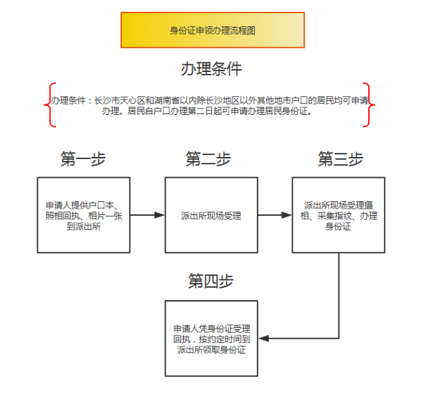 | 办理条件 | 户口在长沙市天心区的居民,在申请领取、换领、补领居民身份证期间,急需使用居民身份证的,可以申请领取临时居民身份证 |