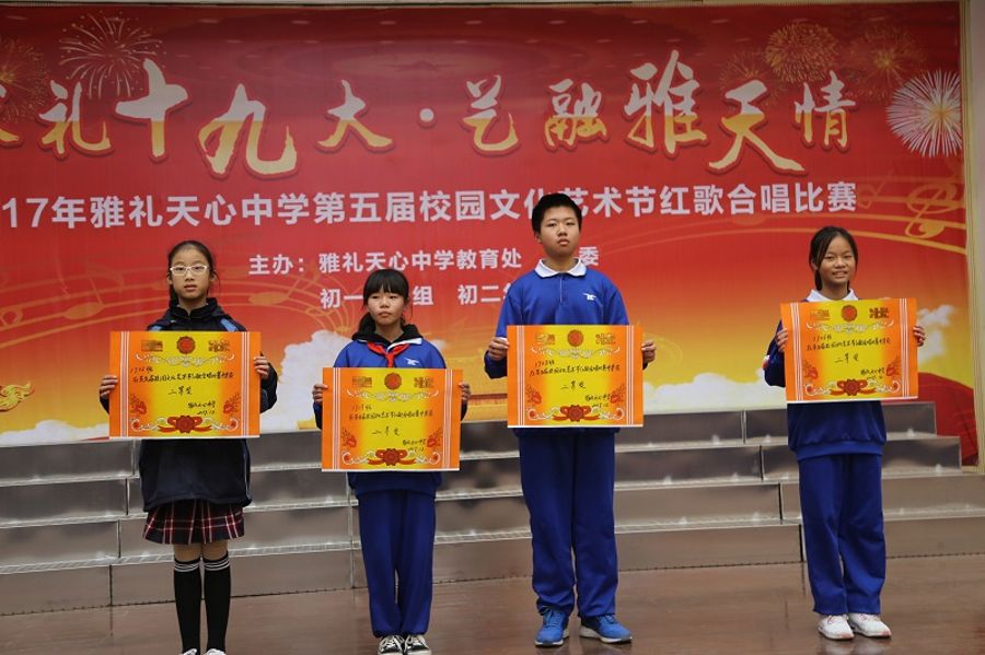 本次比赛分别评出初一、初二两个年级最佳合唱歌曲奖和最佳指挥奖各一名。雅礼天心中学龚玉刚校长说:“音乐是一门艺术,它能陶冶情操,凝聚班级的力量,音乐还可以增强我们人生的厚度和温度。”龚校长还真诚地与同学们分享了自己的初中音乐老师的感人故事,并当场清唱了一曲《滚滚长江东逝水》,赢得现场阵阵掌声,为比赛画上圆满句号。