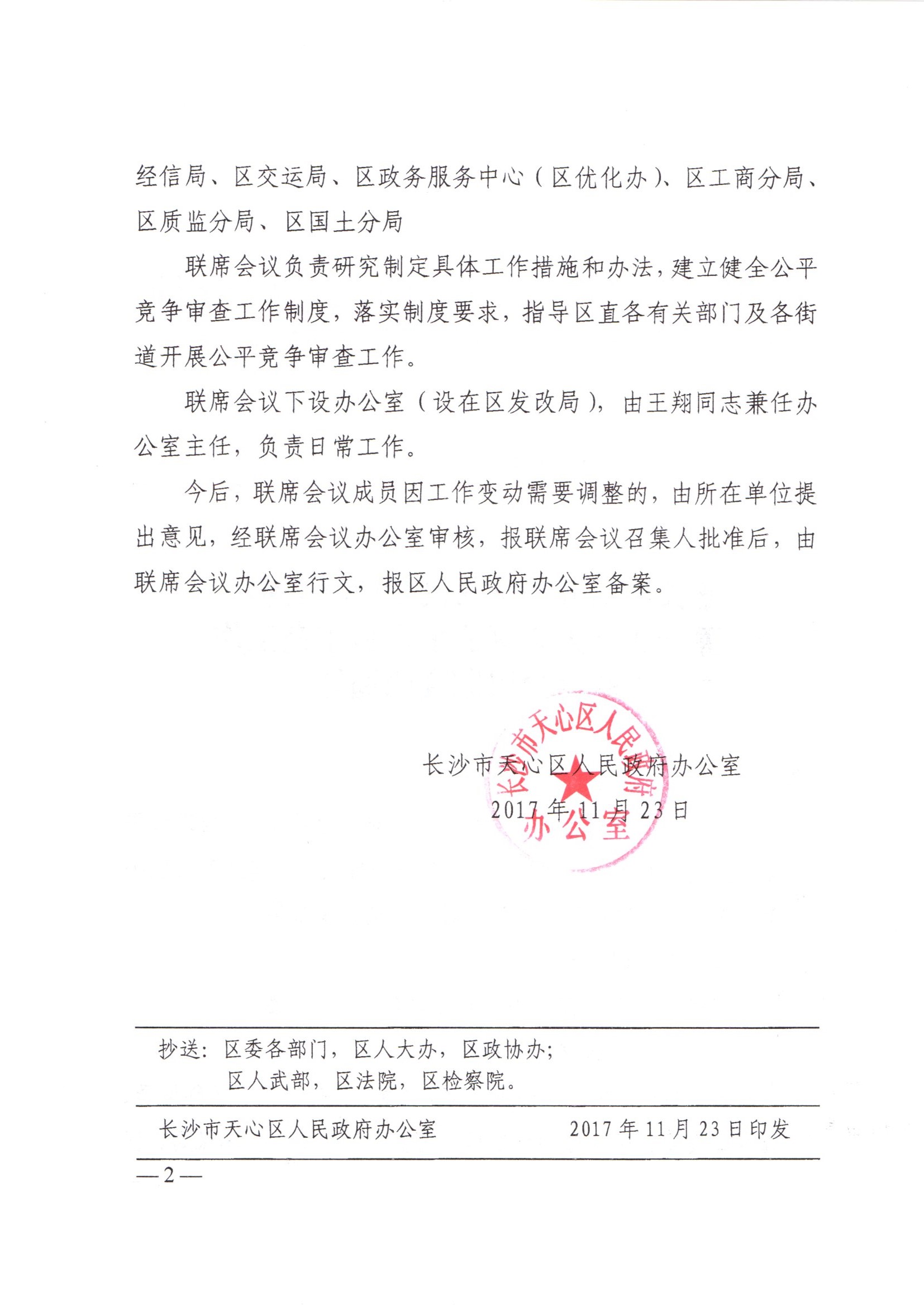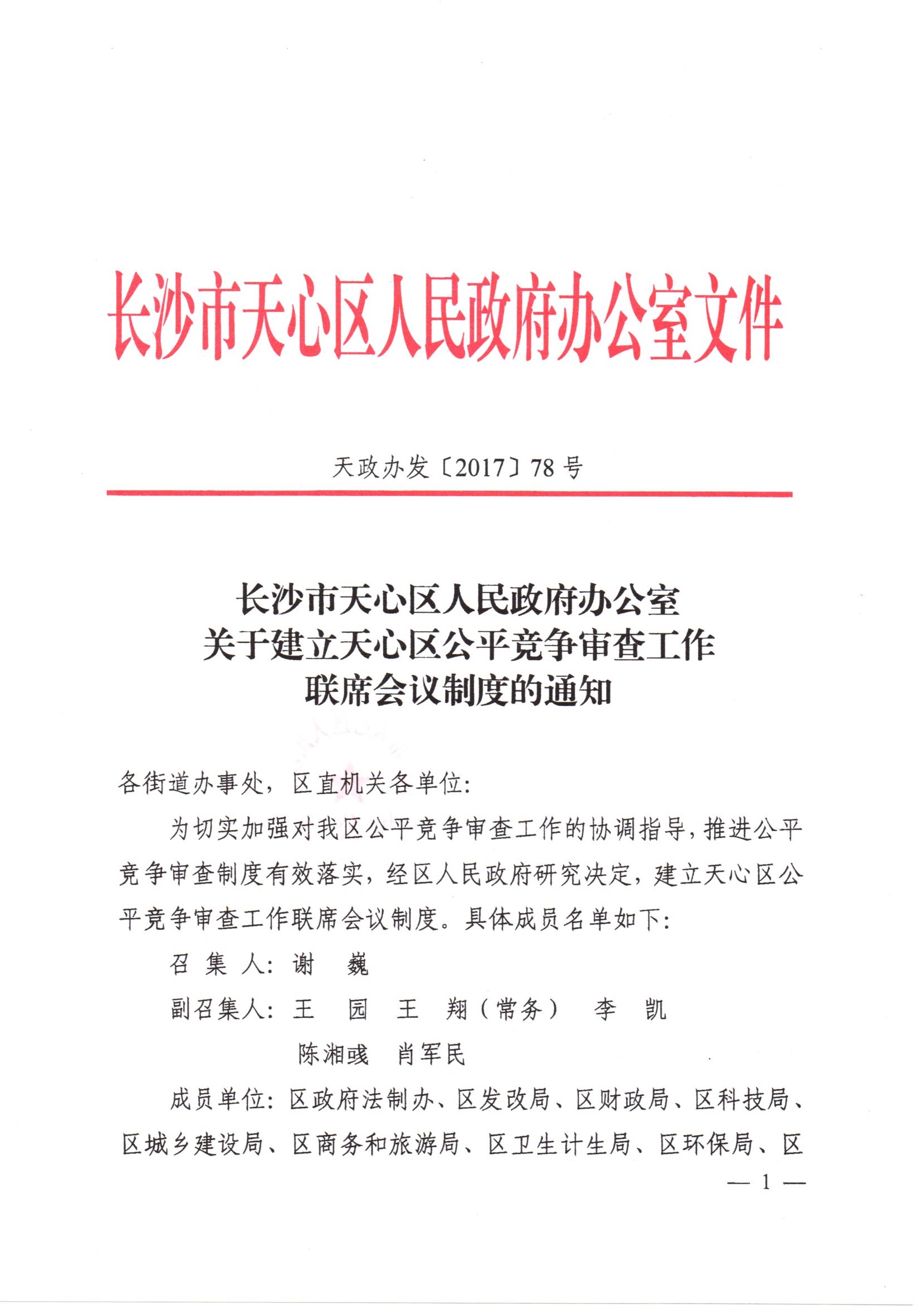 关于建立天心区公平竞争审查工作联席会议制度的通知
