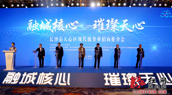 2017年11月26日下午,“融城核心·璀璨天心”2017年长沙天心(深圳)现代服务业招商推介会在深圳举行,招商会现场签约近200亿元,会上,全国异地长沙商会天心区服务站正式启动。长沙市委常委、统战部长谭小平,天心区委书记朱东铁,天心区领导周志军、贺国权、刘向、侯向宇、罗超纲及相关单位负责人出席。