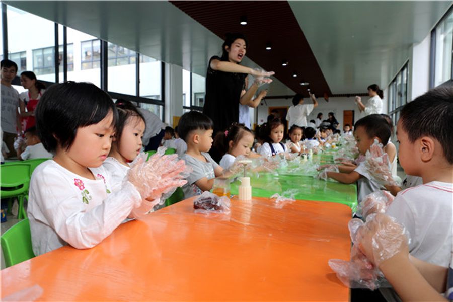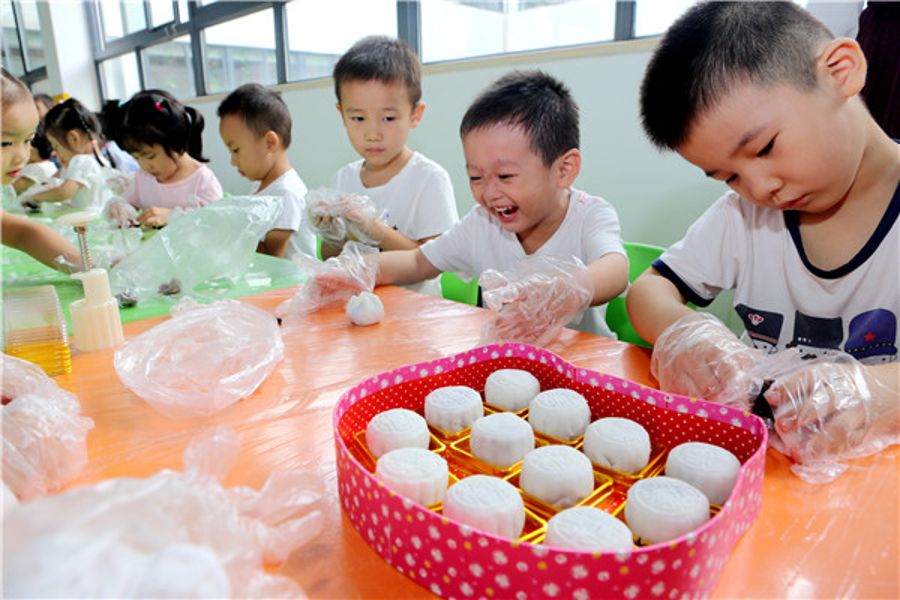 孩子们在志愿者姐姐们的指导下,学习月饼制作技艺