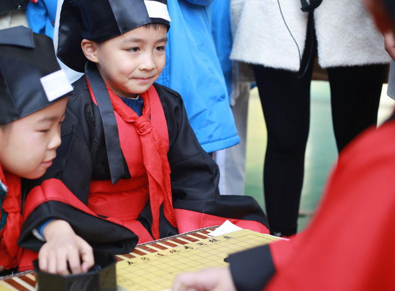 图为:“小棋手”身着传统汉服在棋桌前正襟危坐,从容对弈。
