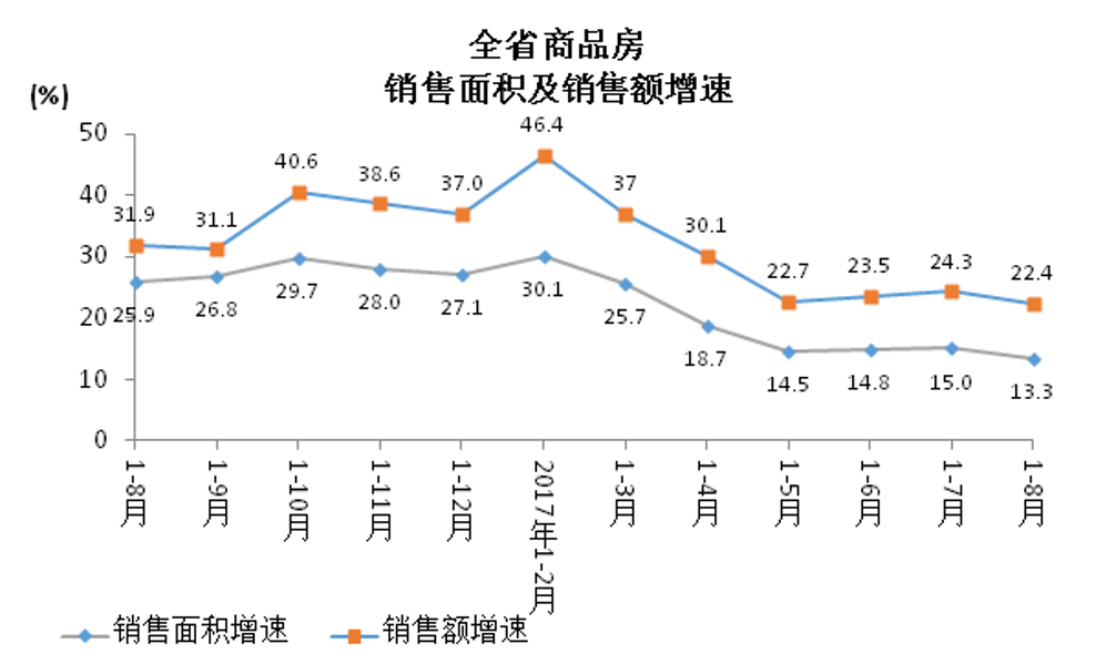 1-8月,全省商品房销售面积4637.84万平方米,同比增长13.3%,比1-7月回落1.7个百分点。其中,住宅销售面积4040.93万平方米,增长9.4%;办公楼销售面积86.21万平方米,增长36.4%;商业营业用房销售面积351.15万平方米,增长59.8%。商品房销售额2357.85亿元,同比增长22.4%,比1-7月回落1.9个百分点。其中,住宅销售额1900.76亿元,增长16.8%;办公楼销售额77.70亿元,增长29.5%;商业营业用房销售额312.49亿元,增长58.1%。