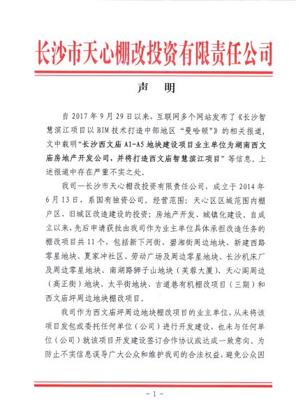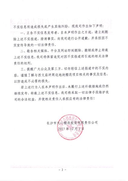 长沙市天心棚改投资有限责任公司声明