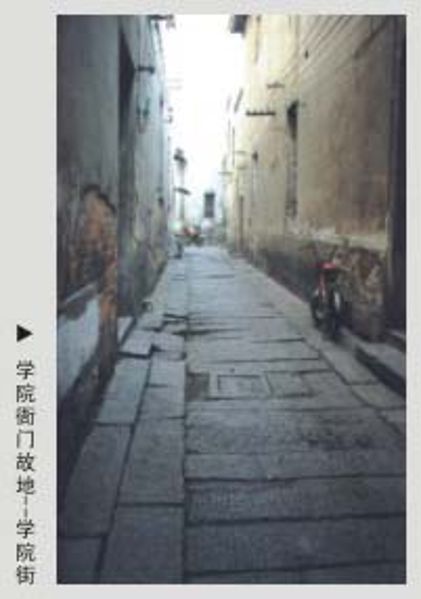 学院街东起黄兴南路,西至学院巷。旧长沙府署原设此街,明设湖南提学道,清康熙四十七年(1708)改为学院衙门,街因而得名。学院为管理全省科举考试的机构,内设考棚,供府试和院考之用。从天妃宫到学院有一石桥,名“登瀛桥”,谓学士登瀛州之意。道光年间湖南学政岳镇南题学院联云: